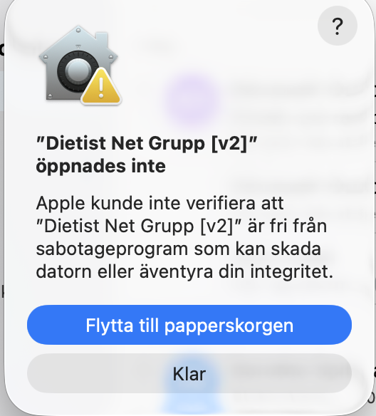 Det kan hända att man inte får öppna programmet genom att dubbelklicka på det (Gate keeper är inställd på att man inte får köra program som inte är hämtade från App Store).